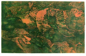 Each of the different value areas on a plate is etched at different length of time. The deeper the etch, the more ink will gather in the etched texture and the more solidly the area will print. To learn to look at the topography of an etching; the metal's subtle clues of process and of the artist's decision-making choices, offers another level to enjoy.