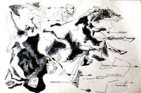One of the most defining aspect of AP Santhanaraj's works would be the quality of line. It is this fundamental element, which sets apart the artists style. He uses this element without any inhibitions exploring it endlessly and creating a unique visual language. As the artist says " I am hungry about painting. What comes out of it, I don't know. All my intentions are not to accept a preconceived form. Circumstances force me to accept a particular form.”